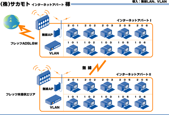 インターネットアパートの足周りとして、ADSL回線を引き、全戸の共用回線とした。その際、各戸同士の通信ができないようにVLANを導入した。 またADSL未提供エリアのアパートでのインターネット接続環境を構築するために無線ルータを導入し、ADSL回線を引くアパートと繋ぎ、回線を共用することで、接続環境を構築した。