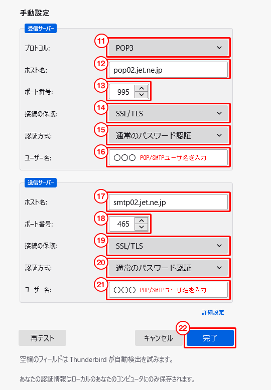 12. 「受信サーバーのホスト名」の欄に、「pop02.jet.ne.jp」と入力します。