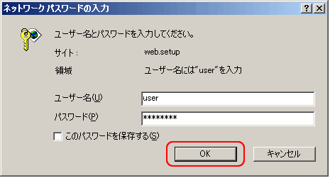 →2.「ユーザー名」欄に「user」、「パスワード」欄に「初期設定時にお客様が設定したパスワード」を入力し、「OK」ボタンをクリックします。